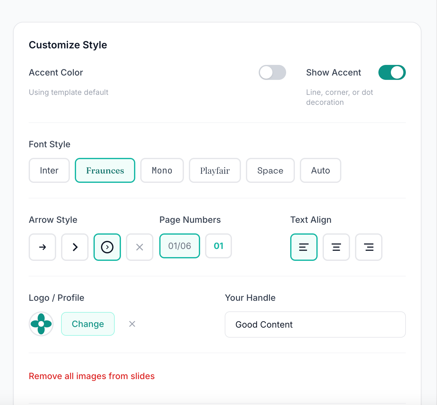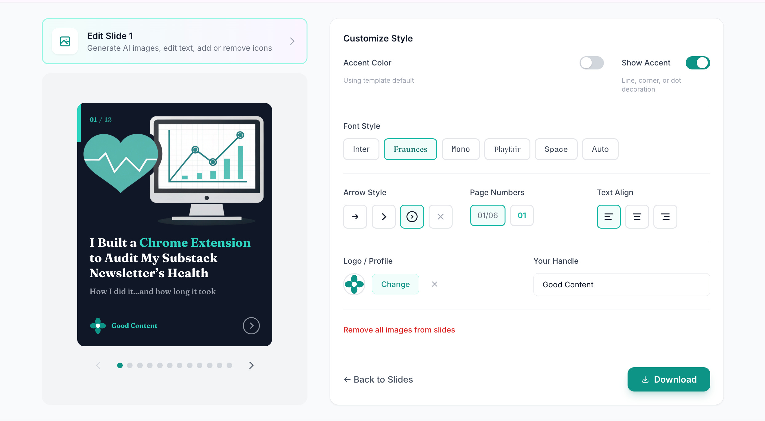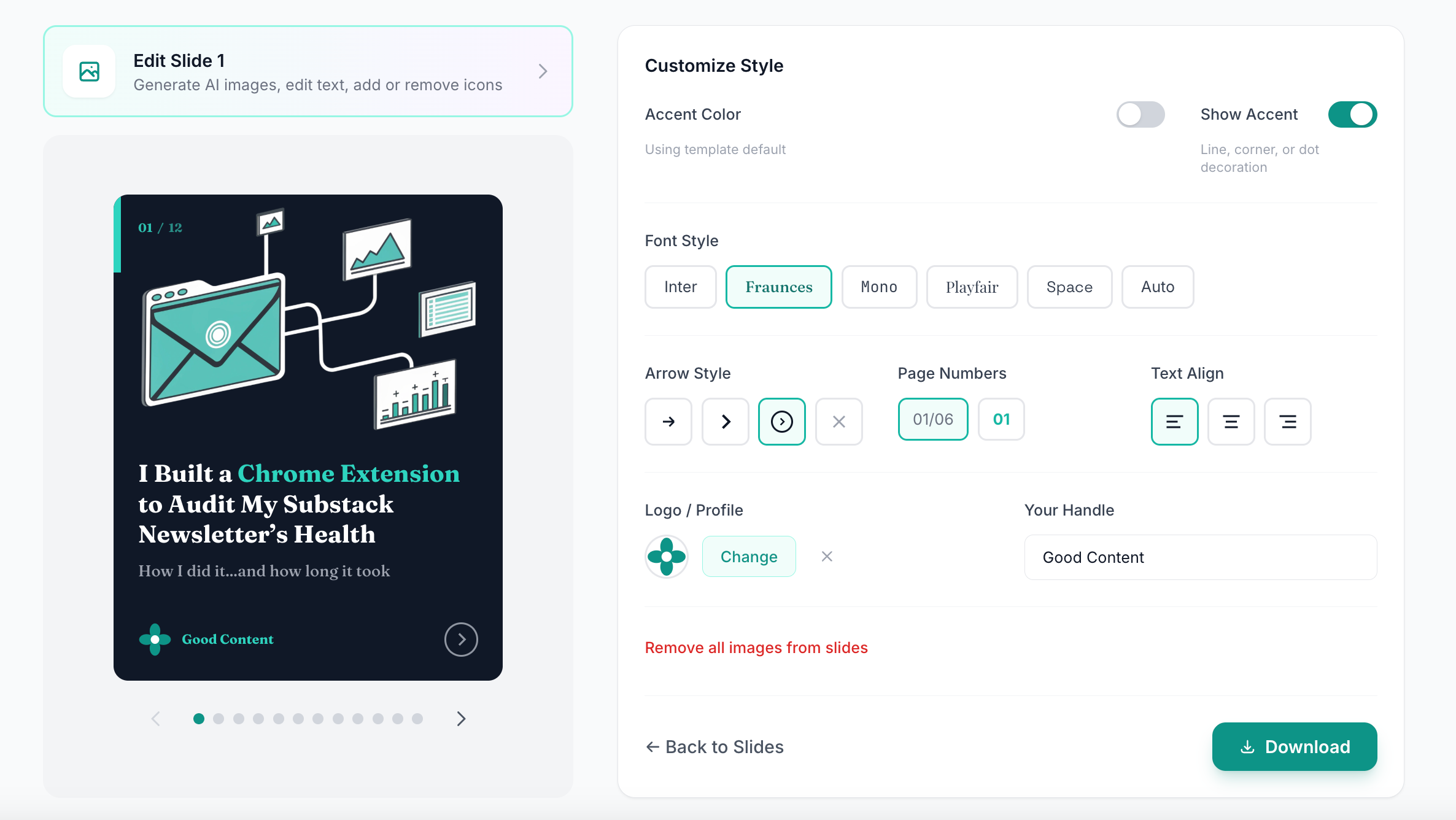 When I asked users what they loved most about the tool, most said the answer was that they didn’t have to make design decisions. The AI generates a first draft of the content that’s just the right length, suggests appropriate layouts (hook slide, stat slide, list slide, quote slide, or call-to-action), and the template system handles all the visual formatting automatically.