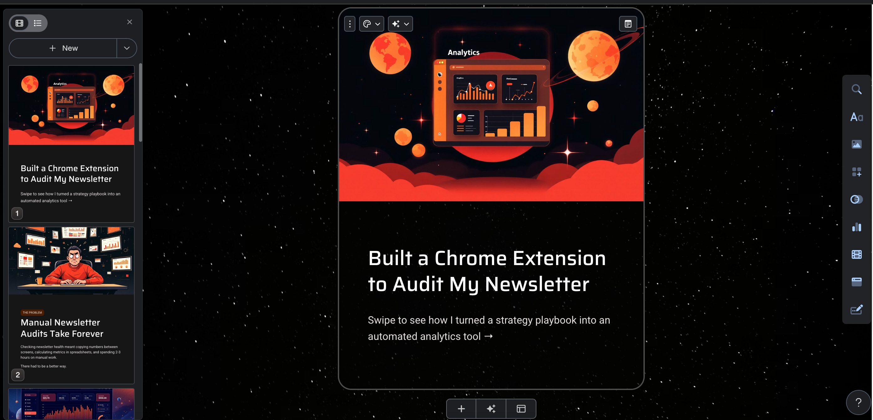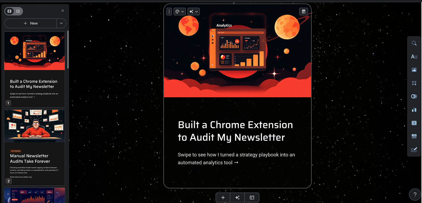What I wanted was simple: a near-instantaneous way to create a carousel from a Substack post, a text snippet, or some rough notes. I wanted to spend maybe 15 minutes on the whole process, mostly editing and customizing the copy. Zero time on cut-and-paste. Zero time fiddling with design elements.