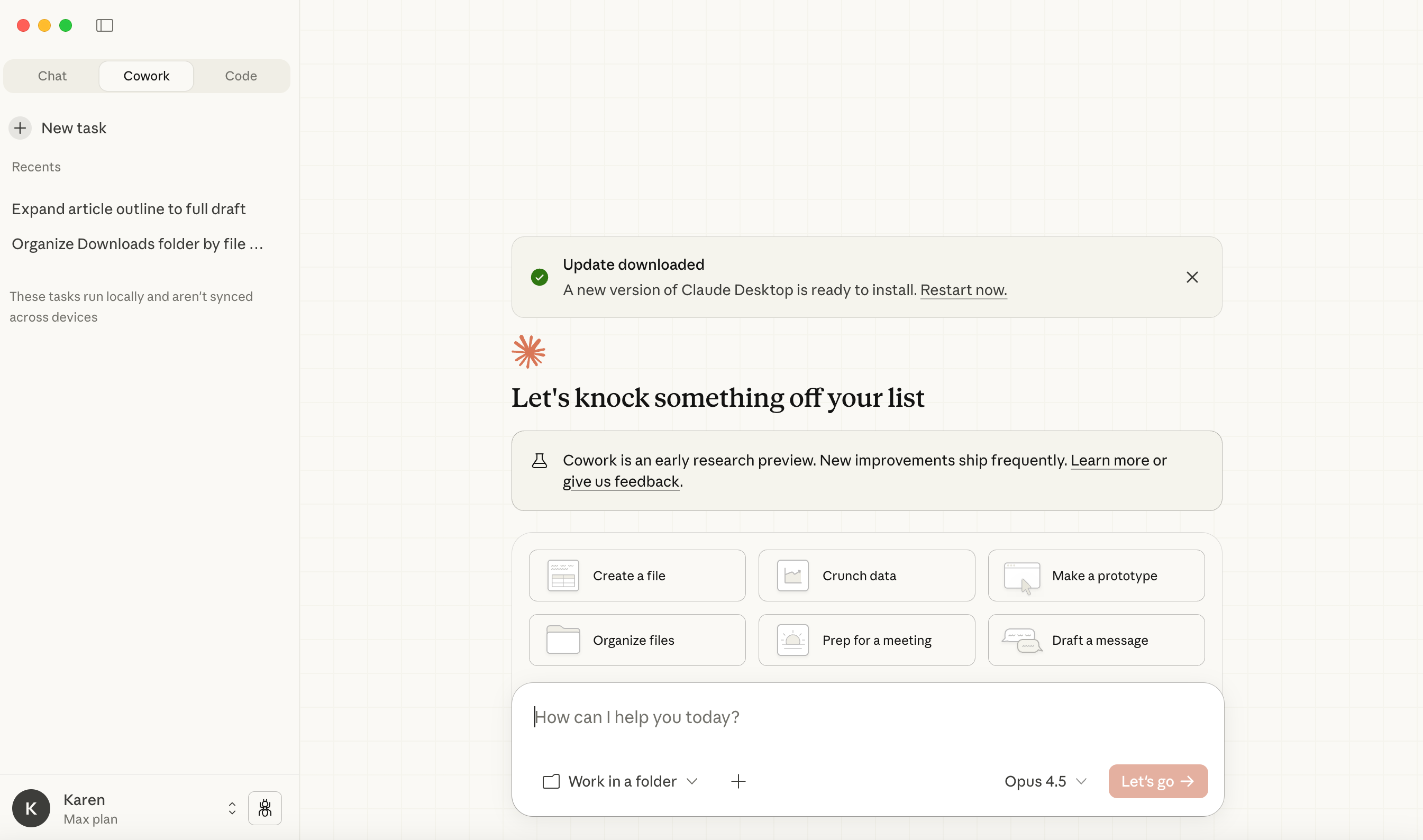 Keep the app open. Cowork requires the desktop app to remain active during execution. Don’t close your laptop or put it to sleep mid-task.