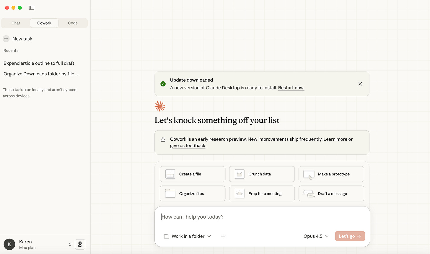 Cowork uses significantly more tokens than regular chat, which is why Anthropic reserves it for paid subscribers. As of this writing, it only works on macOS. Windows and Linux users will need to wait. And you can’t access it from the web or mobile apps. You need the desktop application.
